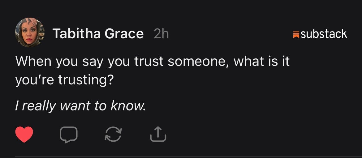 This note from Tabitha Grace stuck with me. I couldn’t shake it from my mind because what is it we are…I am trusting. Who do I trust? What do I truly know about trust? Growing up like myself, I’m sure we all heard phrases like “people have to earn your trust” or “I trust that fool as far as I can throw em.” I can’t recall a time being told what to look for or what it is I’m supposed to be giving my trust to. With trust, like love, maybe we don’t fully grasp what it means. So, at 1:30 in the morning my heart did it’s best to translate what it is I’m trusting when I say, “I trust you.”